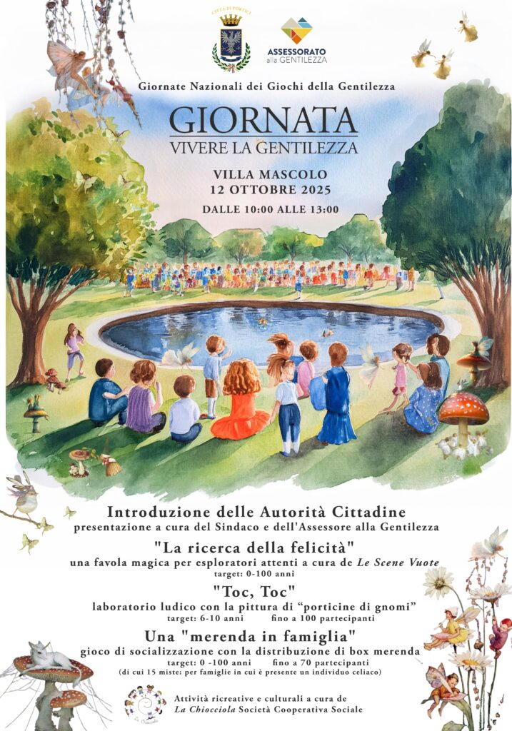 🔎 Nell’ambito de “Le Giornate nazionali dei Giochi della Gentilezza” si terrà la Seconda Edizione della “Giornata Vivere La Gentilezza”. All’ombra degli alberi vestiti d’autunno, tra fate e gnomi, si trascorrerà la domenica mattina insieme all’insegna della Magia delle parole e del fare gentile come strumento di coesione sociale, di pace, di superamento di barriere fisiche e di concetto.
